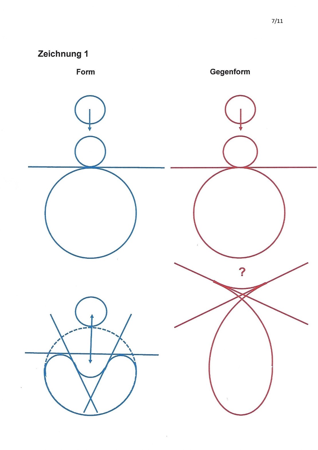 Ich habe mir die Aufgabe gestellt, zuerst die blaue „Dellen-Form“, links unten und dann auch deren rot gezeichnete Gegenform rechts unten aus einem Kreis in ganz kleinen Verwandlungsschritten abzuleiten.