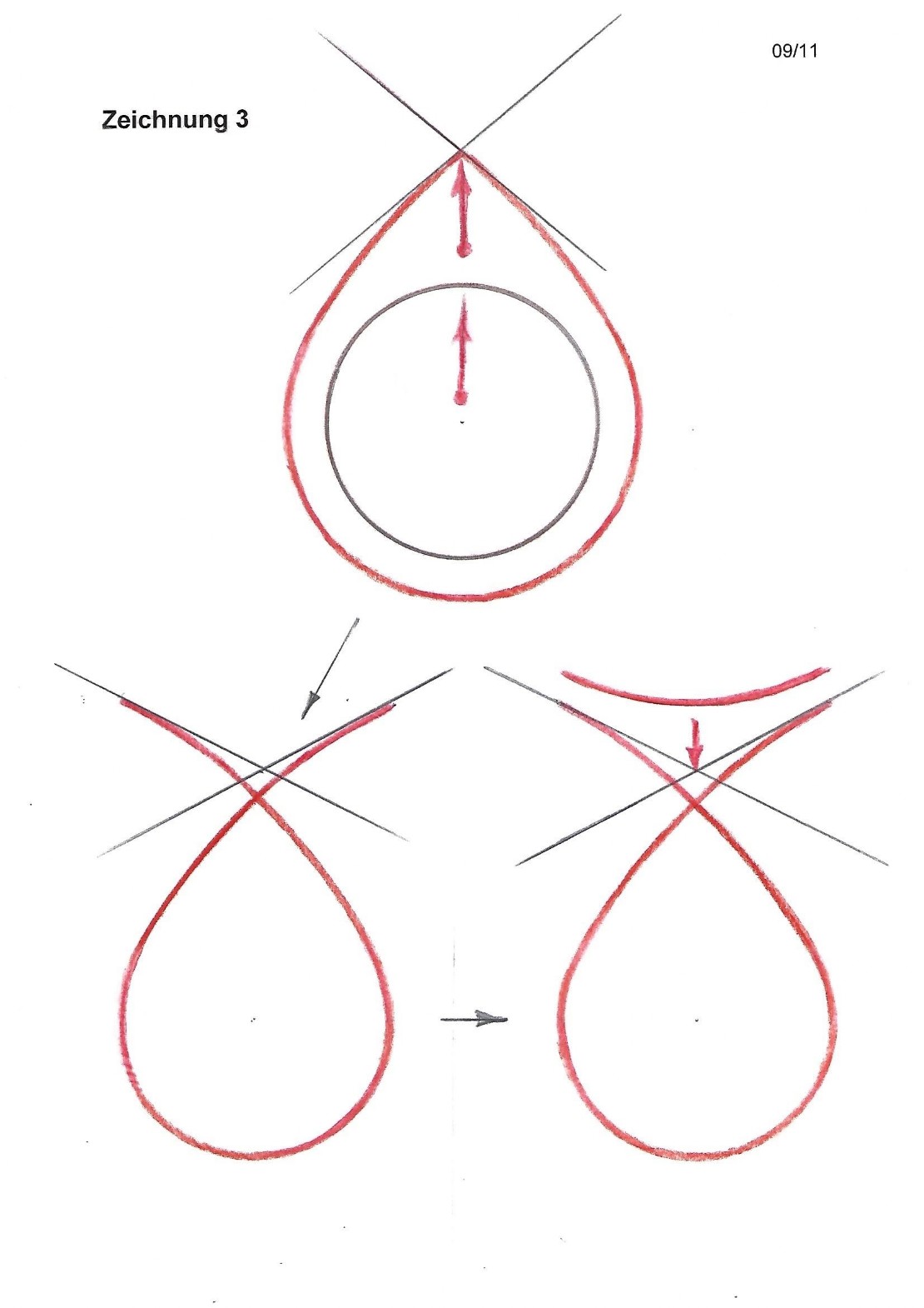 Folgendes habe ich mir dazu überlegt: Den Kopf der Achter-Form lasse ich zu einem Punkt schrumpfen und das heisst, dieser Punkt fällt mit dem Doppel-Punkt zusammen. Dieser wird zu einem gewöhnlichen Kurvenpunkt, die Mehrfachfunktionen der Singularitäten der Achter-Form entfallen, es ist nur noch ein einziger Kreis vorhanden, in Zeichnung 3 oben schwarz gezeichnet. Dieser soll - im Gegensatz zum grossen blauen Ring in Zeichnung 1 – ein elastisch verformbarer Ring sein. Das heisst, wenn der rote Ring verformt wird und die verformende Kraft zu wirken aufhört, dann federt der Ring wieder in seine ursprüngliche Kreisform zurück.