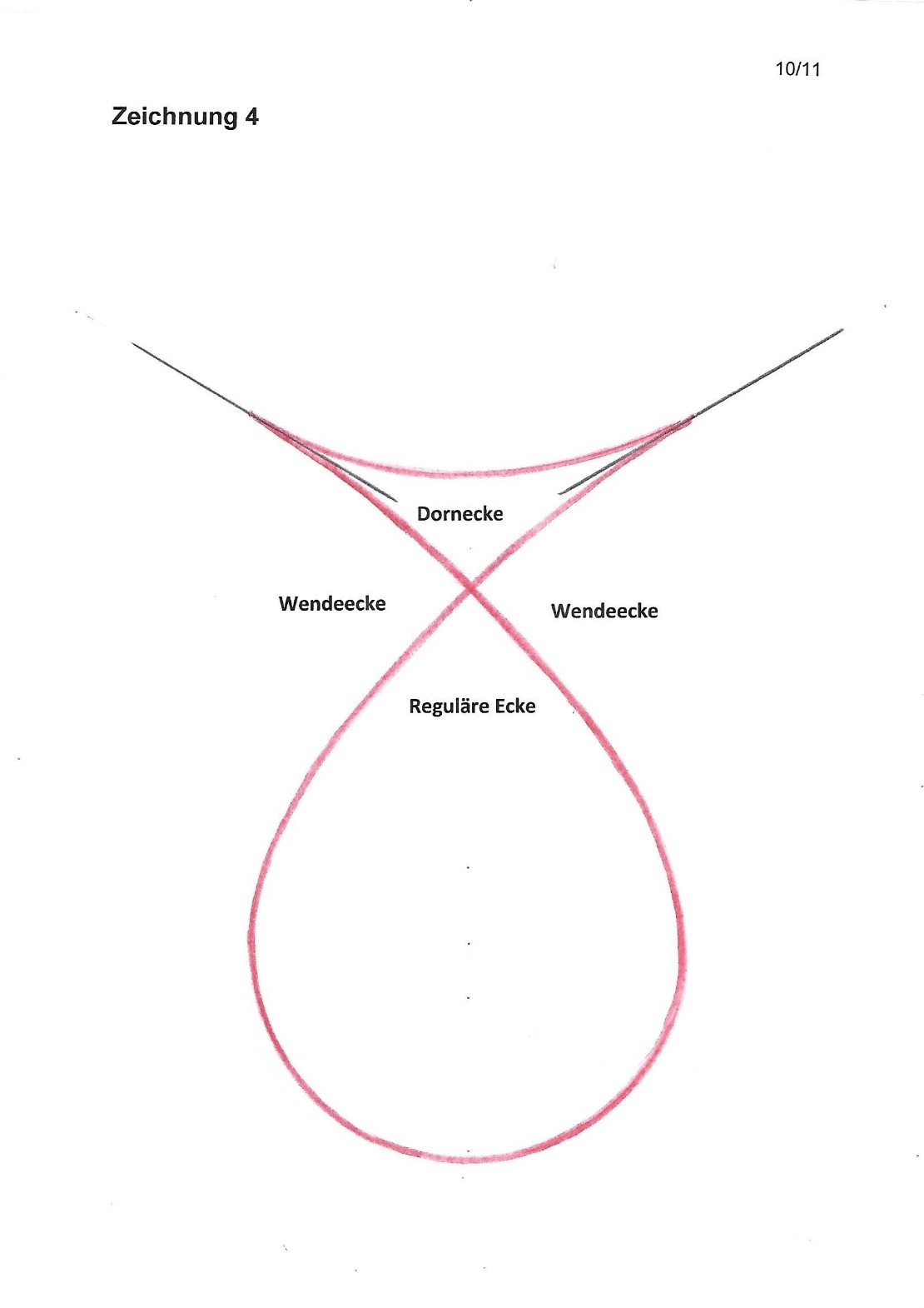 Auf diese Weise kann ich mir vorstellen, wie aus dem elastisch verformbaren, kreisförmigen Ring in kleinen und kleinsten Schritten die Dorn-Spitzen/Doppel-Punkt-Form entstehen kann. Sie ist in Zeichnung 4 mit den zugehörigen Ecken nochmals dargestellt.