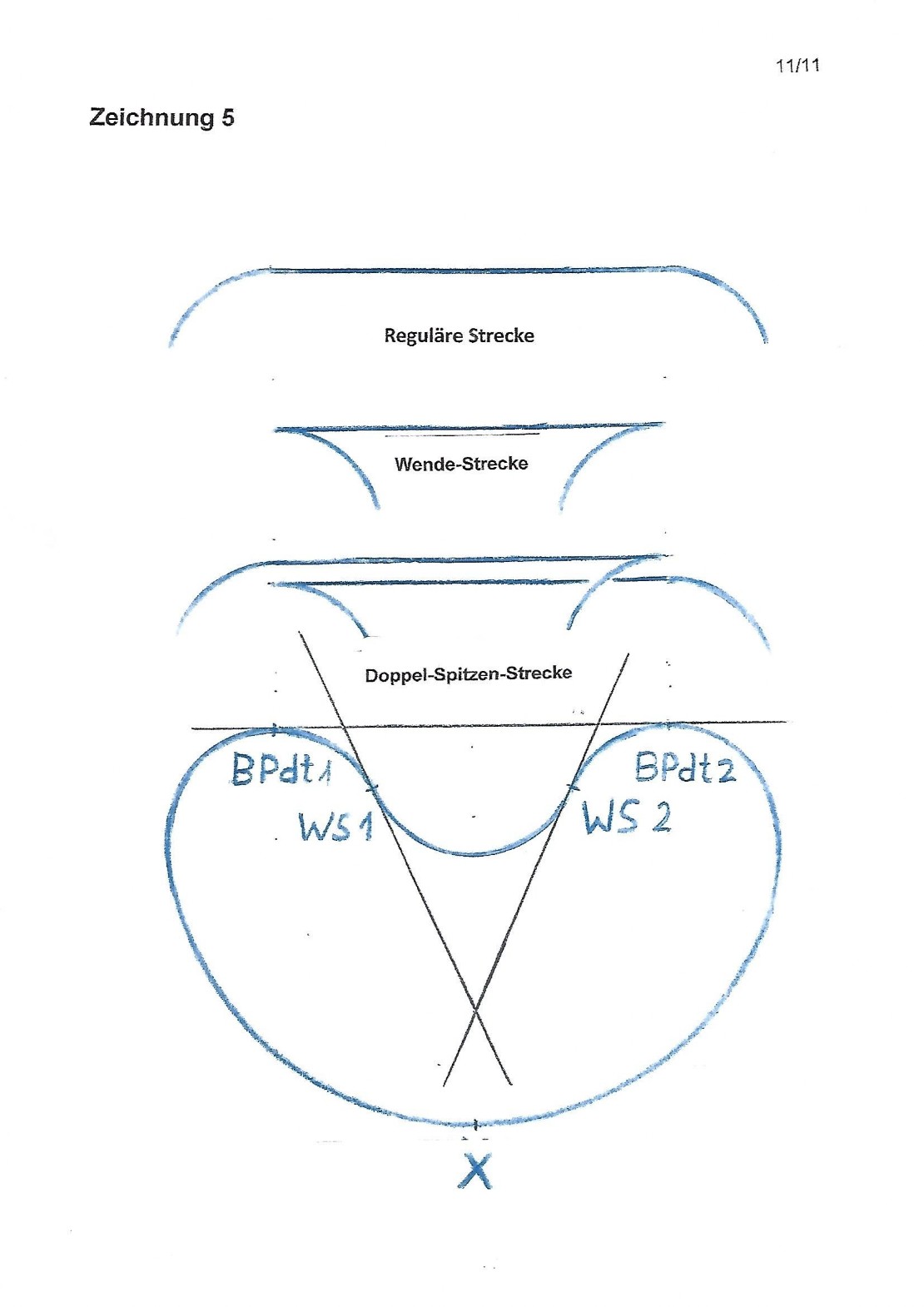 3. Von X auf dem Einfachen Bogen zu BPdt1, dann auf der Doppel-Tangente zu BPdt2 und über den Einfachen Bogen zurück zu X. Dieser Teil der Kurve enthält eine Reguläre Strecke, wie sie in FGEK Seite 96, Figur 104 oben gezeichnet ist.